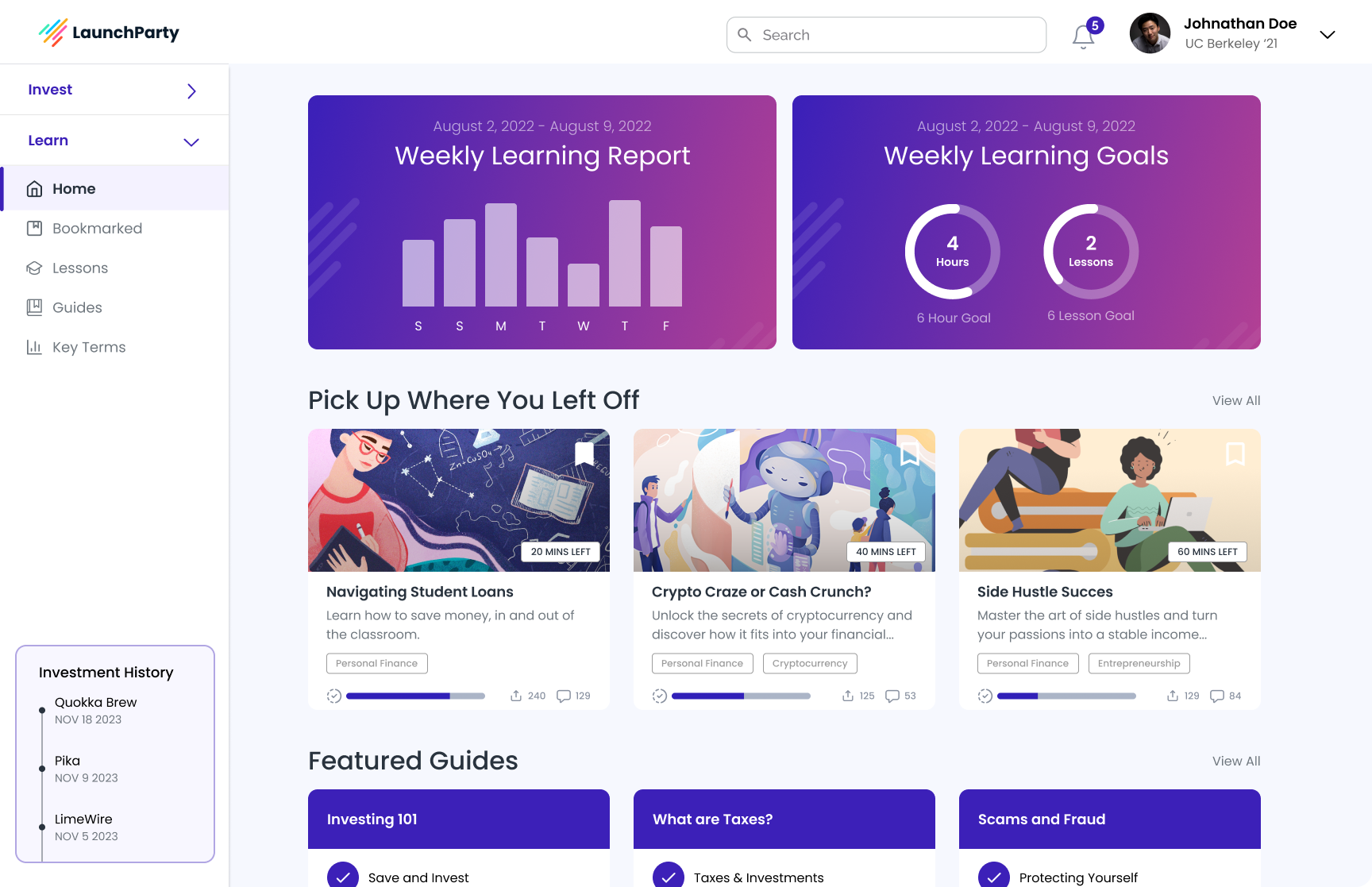 Traditional investing platforms rarely offers guidance to young entreprenurs and investors. Launchparty bridges this gap by teaching and empowering students to invest in startups from their college networks, with contributions starting as low as $50.